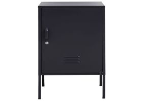 Made from Black powder coated metal, this tall single door cabinet reveals two adjustable shelves offering compact storage. The cabinet with a handle matches the sleek legs that provide firm support. Ventilation holes at the bottom circulate air through the cabinet.
