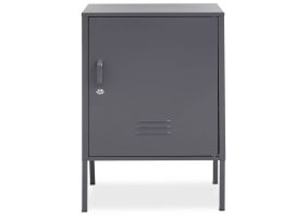 Made from grey powder coated metal, this tall single door cabinet reveals two adjustable shelves offering compact storage. The cabinet with a handle matches the sleek legs that provide firm support. Ventilation holes at the bottom circulate air through the cabinet.