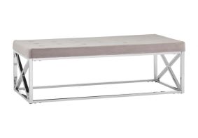 Soft velvet upholstery lends texture to this sophisticated luxe-style accent piece. The base of the Allure bench features simple angular design lines, broken up by the geometric pattern created at each end. Made from smooth stainless steel, it boasts a reflective silver finish. The thick cushioned seat is made from soft Mink velvet, creating a tactile counterpoint to the sleek steel. Coordinate with metallic tones.