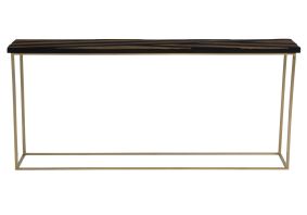 This contemporary Aris console table has an abstract striped metallic black and gold acacia wood top, supported by a sleek black aluminium frame. This sleek and modern console features a sleek and sturdy metallic black aluminium frame. The top of the table is crafted from black and gold finished acacia wood, modelled into a unique abstract pattern.