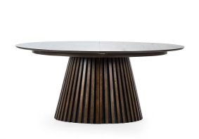 Discover the ultimate dining experience with the Arya Extending Dining Table – a masterpiece of modern design infused with Japandi elegance. Crafted from rich dark oak MDF veneer, it transforms effortlessly from a striking circular shape with a ribbed, coned base to an elongated oval with dual supports, combining sophistication and functionality. Its sleek, adaptable design serves as an elegant focal point, effortlessly adjusting to suit both intimate dinners and larger gatherings. Adding a refined touch to any dining space with its blend of minimalist beauty and luxurious detail.