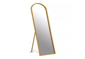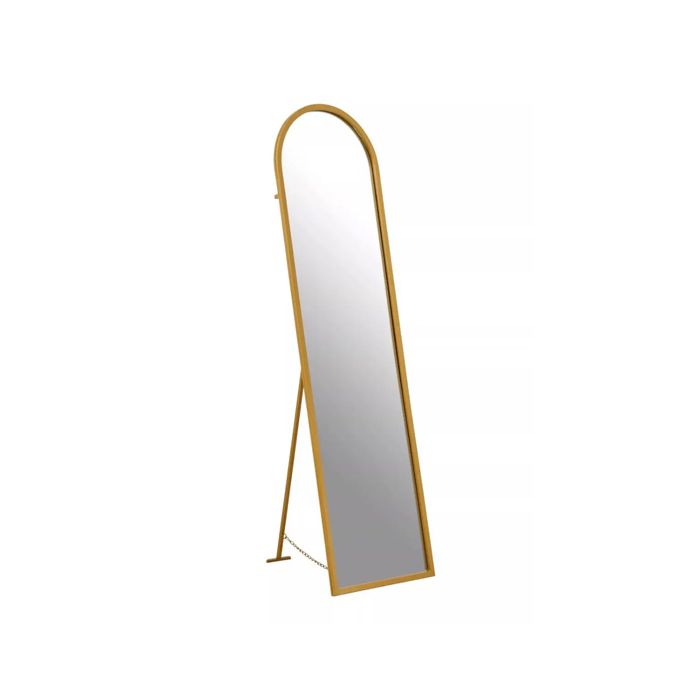 This floor mirror has a captivating rectangular shape with a curved side. It features a sleek and slender Gold iron frame that adds a touch of luxury. Its minimalist profile allows it to seamlessly blend into various decors.