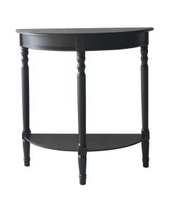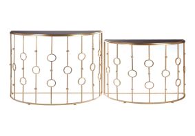 The Faiza console tables introduce a warm metallic accent to the hallway or living room. Both tables have a half moon design, with frames made from smooth metal that boasts a rich gold finish. The slim vertical lines are interrupted by hoops to give the tables a hint of art deco style. Their tops are made from glass, coloured black to complement the gold. Display them as part of a luxe design theme.