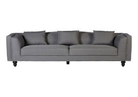 Silver coloured stud detailing adds a cool metallic accent to the Feya chair. The spacious three seat Feya sofa features a low back, level with the armrests. Upholstered in tactile fabric, the chair's dark Grey colour coordinates with the glossy Grey finish of the feet. Carved and rounded, the feet complement the subtle curve of the chair's design. Three matching back cushions enhance comfort.