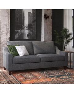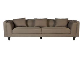 Silver coloured stud detailing adds a cool metallic accent to the Feya chair. The spacious three seat Feya sofa features a low back, level with the armrests. Upholstered in tactile fabric, the chair's dark Mink colour coordinates with the glossy Mink finish of the feet. Carved and rounded, the feet complement the subtle curve of the chair's design. Three matching back cushions enhance comfort.