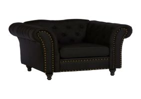 Designed in the traditional Chesterfield style, the Flint chair feels both sophisticated and elegant. Adopting a classic silhouette, the Flint chair features elegant scroll arms that create a sense of grandeur. The back and armrests are button-tufted, while metallic stud detailing contrasts with the chair's tactile black fabric upholstery. Four knopped feet, crafted from sustainable eucalyptus wood, raise the chair from the ground.