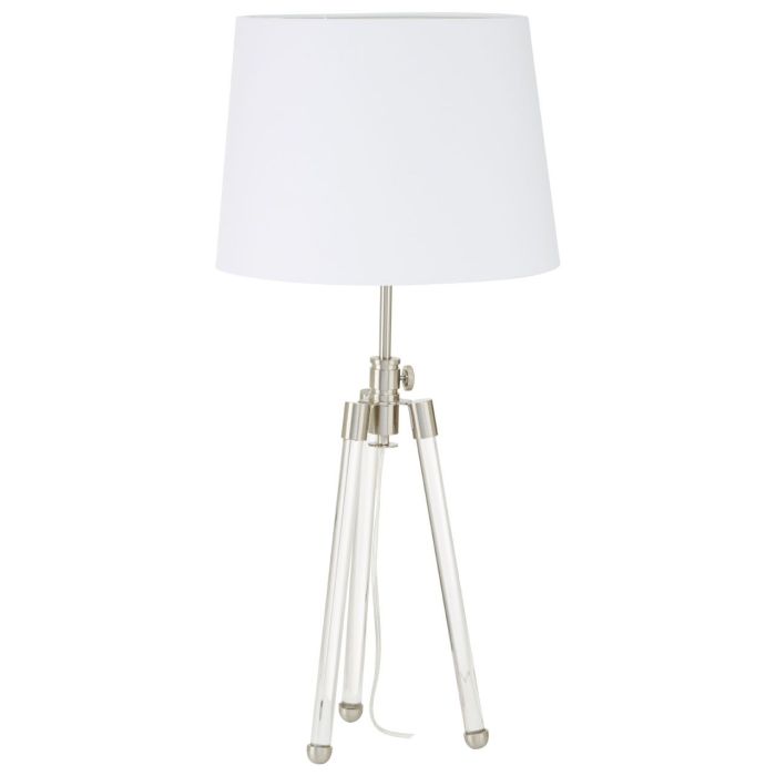 This table lamp’s trio legs are crafted from nickel finish metal and covered with translucent crystal. The tripod design ensures its stability on the tabletop while metallic silver ball feet add a minimal decorative appeal. The white fabric shade contributes to its pleasing aesthetic and complements lamp’s overall minimalist design. The Halia tripod base table lamp features a combination of metal and crystal which gives it a contemporary glam.