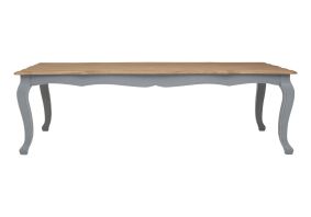 The Henley dining table's undulating apron complements the curved lines of its legs, both of which are accentuated by subtle carved detail. Both have an antique grey finish that is slightly weathered.