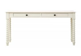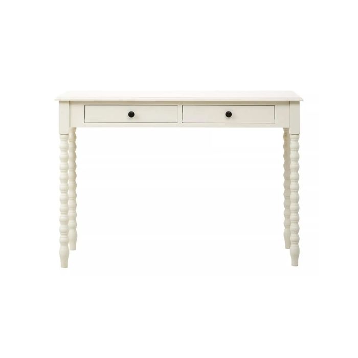 This rectangular Ivory finish pine desk exhibits a traditional charm with its carved legs. It features two drawers with sleek metallic silver handles for a modern touch. The desk is both functional and stylish for any home office space.