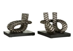 These rope design bookends can be used to help tie together a breezy coastal interior setting. The antique silver finish draws out the textured twine of each rope, their curling loop giving these sculptural pieces a sense of dynamism. The black plinths provide a subtle tonal contrast to the rope's silvers and blacks. Formed from strong and weighty polyresin, use these decorative pieces to keep books organised on top of a shelf or side table.
