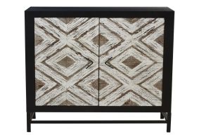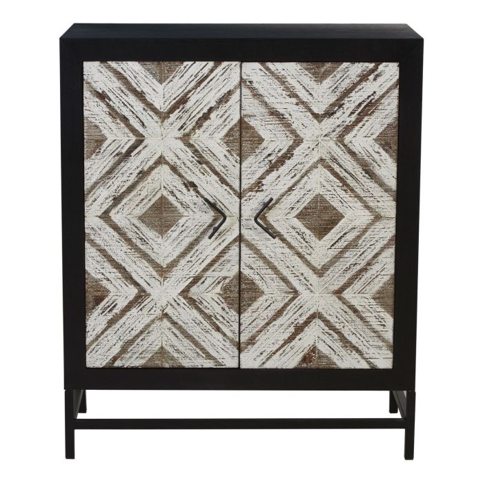 This two door cabinet features a monochromatic design and has ample space for storage of multiple small items. The Lombok 2 door wooden cabinet is adorned with a geometric pattern that is accentuated by a distinctive weathered effect. The muted white finish is contrasted with the black coated metal frame ensuring a modern, monochromatic look. Store bottles, glasses or tableware in the shelved, two door cabinet.