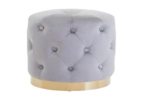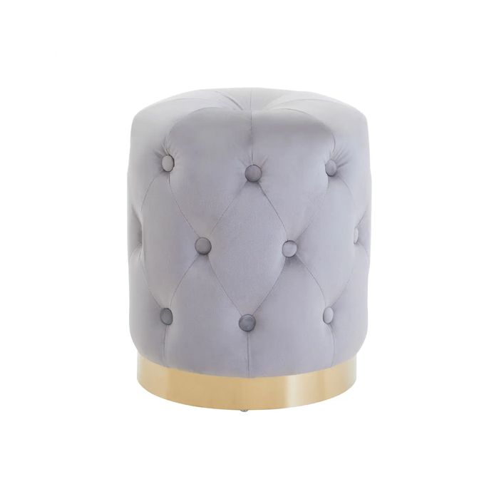 Add a touch of luxury to your home decor with the Loretta grey velvet button tufted stool. It is upholstered in smooth grey velvet textile which is complemented by the matte gold metal round base.