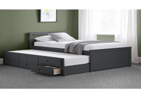 Finished in a crisp Anthracite lacquer, the Maisie bed features a traditional slatted headboard. Providing sleeping space for two people, this bed includes a pull-out underbed and additional storage drawers, maximising the available floor space. Perfect for any children���������s bedroom or guest room.