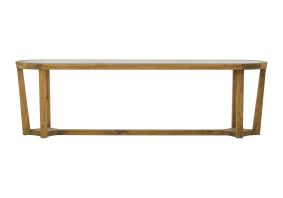 This console table has an antique zinc top that counterpoints the frame's warm natural hues. This table has a carved alder wood base with a rich natural grain. It has three clean-lined, angled legs on each side and a top made from smooth, tactile antique zinc.