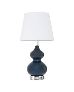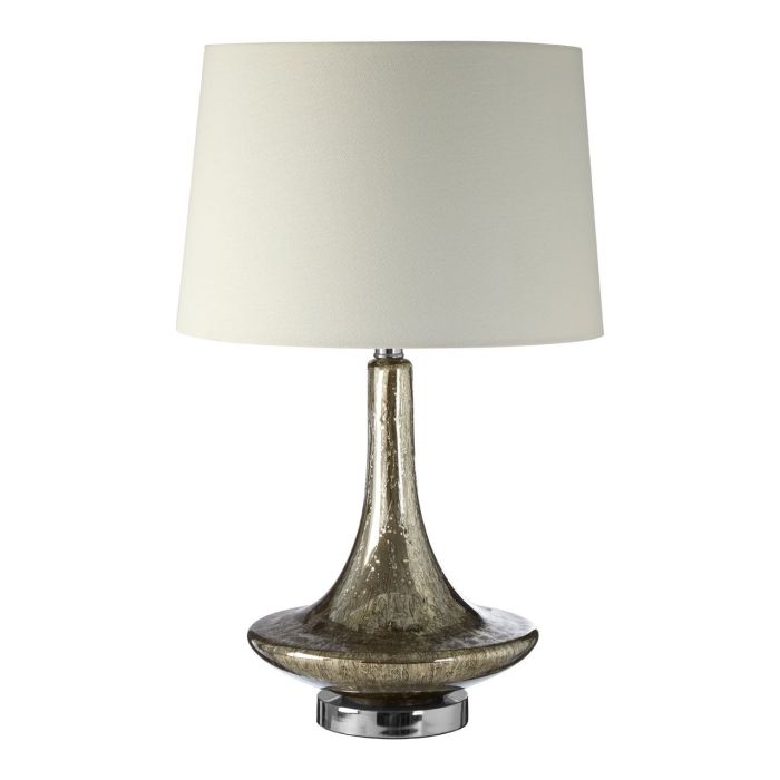 Constructed to form a droplet design, this table lamp has a textured base in a polished champagne finish. The base is formed from glass and has a weathered finish that forms a distinctive, irregular pattern. The lamp has a silver coloured ring pedestal that introduces a reflective metallic element to the aesthetic. This table lamp has a broad base featuring a slim neck that is topped with a slightly tapered white fabric shade.