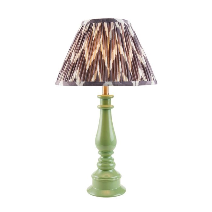Getting its inspiration from turned classic staircase spindles, this table light is finished in high gloss Cotswold Green colour resin, with a switched B22 brass lamp holder and pale braided fabric flex. Finished with our bright Pearl Grey 30cm Zigzag shade to complete this timeless country luxe look.