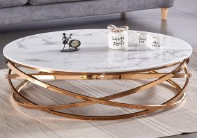 Nabraska Round Wooden Coffee Table In White Marble Effect With Gold Frame