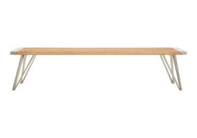 The Nanrdri bench features a slatted seat made from teak wood. The wood has a light, golden colour that allows its bold grain to stand out clearly. The wood is sealed and lacquered for a smooth finish. Contrasting this natural, organic material is the antique finish iron sides and legs that finish in a point.