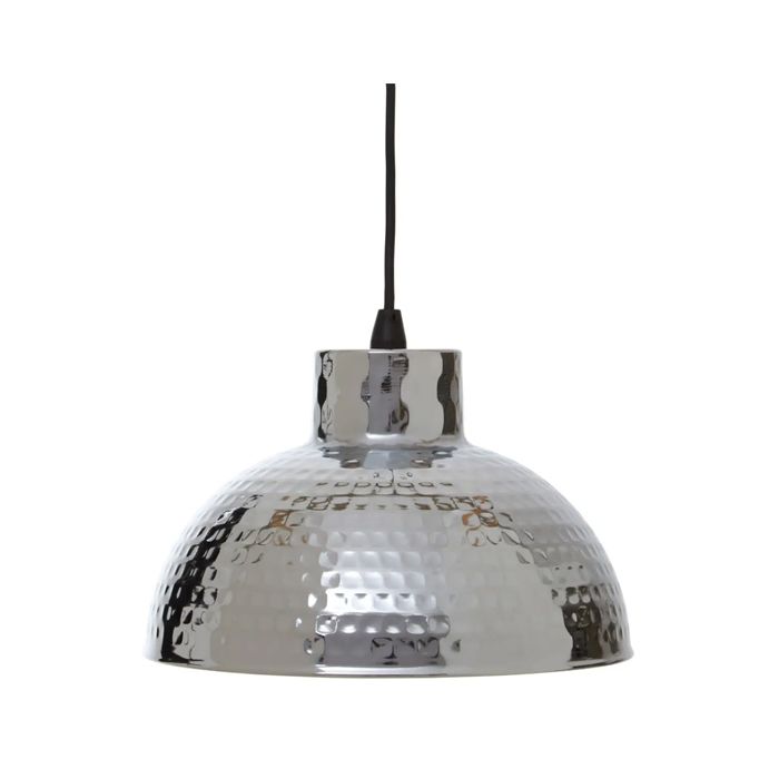 This pendant light has a minimalist design with a round semi spherical body. The surface of the light shade is hammered, which accentuates the chrome finish.