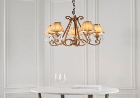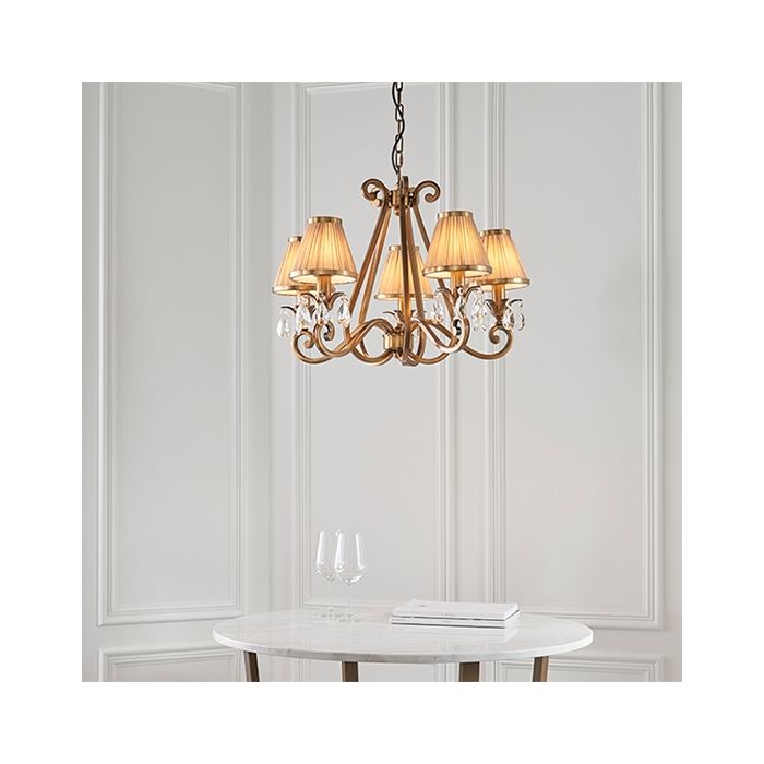 A 5 light pendant from the Oksana Antique Brass range. Featuring faceted lead crystal droplets and Beige pleated shades with a Antique Brass trim. Matching items available and compatible with LED lamps.