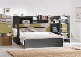 Experience the perfect blend of style, functionality, and fun with the Owen Bunk Bed in Anthracite. This versatile piece features a cosy single bed perched above a removable small double underbed, offering flexibility for sleepovers or extra lounging space. The built-in shelving, both inside and on the front, provides ample room to showcase decorative items, books, and toys, keeping your child's room organised and vibrant. The study ladder ensures easy access to the top bunk while adding a touch of modern design. Transform any room into a stylish haven of creativity and comfort. Mattress sold separately.