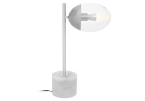 This table lamp has a clean and modern design. It features a clear glass globe shade that is supported by a sleek chrome finish metal stem and a sturdy round white marble base, creating an ambient glow in any room.