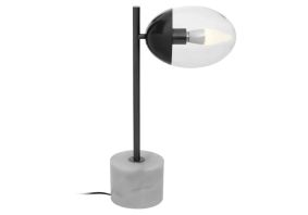 This table lamp has a clean and modern design. It features a clear glass globe shade that is supported by a sleek black metal stem and a sturdy round white marble base, creating an ambient glow in any room.