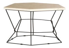 The Ripley side table is a combination of natural mineral material and minimal iron. Its hexagonal top is formed from a single piece of onyx stone, with a natural colour which is patterned by the banding that this mineral is renowned for. The base contrasts with its powder coated black, and is made from strong iron.