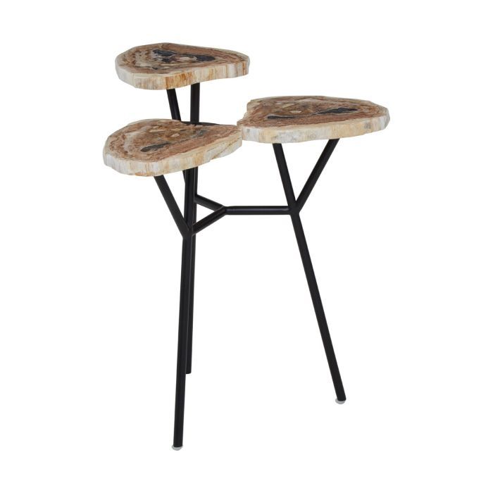 The Ripley mushroom-shaped side table is a unique and distinctive style. A unique and distinctive style, the Ripley side table is a statement piece. Three black metal legs branch out at the top to reach three slices of petrified wood forming tabletops. One tabletop, ideal for a lamp, reaches higher and the other two form a wider base on which books, candles or ornaments could be placed.