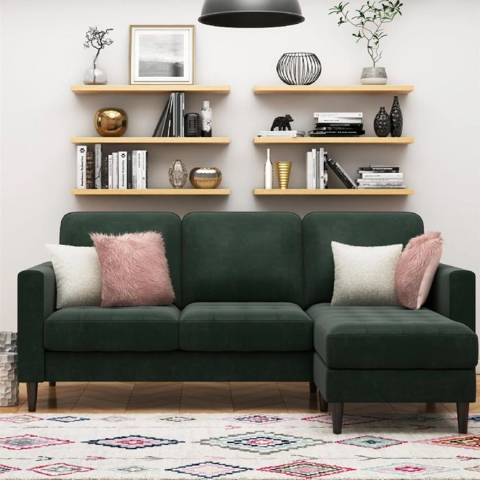 Strummer Velvet Reversible Corner Sofa In Green With Black Legs