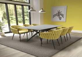 • Table Material : Sintered Stone Ceramic Top, Metal • Table Finish : Grey • Chair Material : Braided Fabric, Metal • Chair Finish : Yellow, Black • This trendsetting 1.8m Ceramic Top dining table is set off by fashionable diagonal orange and white criss cross markings • The sturdy 12mm thick ceramic table top comes in an attractive reflective grey finish • Completed by stylish black powder coated metal X-frame legs • Featuring unique braided Yellow fabric upholstery, woven by hand • Generous padded bucket style seat is complemented by high arm rests with a support bar • Equally at home in an accent or dining setting • The stylish look is completed by sleek black metal tapered legs • Assembly required • Fantastic-Value, Only at Elegant Furniture UK