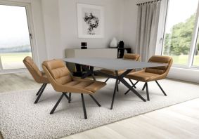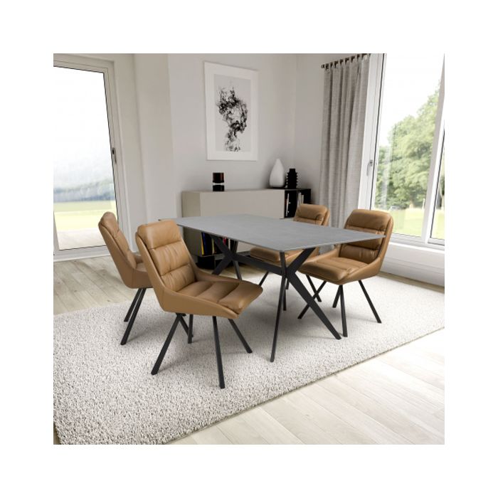 • Table Material : Sintered Stone Ceramic Top, Metal • Table Finish : Grey • Chair Material : Leather Effect, Metal • Chair Finish : Tan, Black • This trendsetting Large Ceramic Top dining table is set off by fashionable diagonal orange and white criss cross markings • The sturdy 12mm thick ceramic table top comes in an attractive reflective Grey finish • Completed by stylish Grey powder coated metal X-frame legs • A highly luxurious padded swivel dining chair • Upholstered in Tan leather effect • Contoured seat and back with horizontal tufted segments • Grey metal tapered legs with a self returning swivel mechanism • Assembly required • Fantastic-Value, Only at Elegant Furniture UK