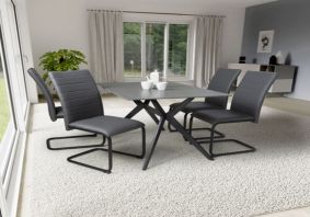 • Table Material : Sintered Stone Ceramic Top, Metal • Table Finish : Grey • Chair Material : Leather Effect, Metal • Chair Finish : Grey • This trendsetting Small Ceramic Top dining table is set off by fashionable diagonal orange and white criss cross markings • The sturdy 12mm thick ceramic table top comes in an attractive reflective grey finish • Completed by stylish black powder coated metal X-frame legs • A modern dining chair • Upholstered in durable grey leather effect • Horizontal centre stitching • Supplied with black metal legs • Fantastic-Value, Only at Elegant Furniture UK