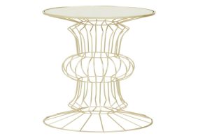 The Yaxi is a contemporary wireframe side table with a metallic Light Gold finish. The Yaxi side table adds luxe design style to the living room. Its architectural frame is crafted from tough iron, with a corset-like middle that accentuates the round top and base. The iron has a sleek Light Gold finish that complements copper and bronze metallic accessories. A pane round of mirrored glass is set into the top.